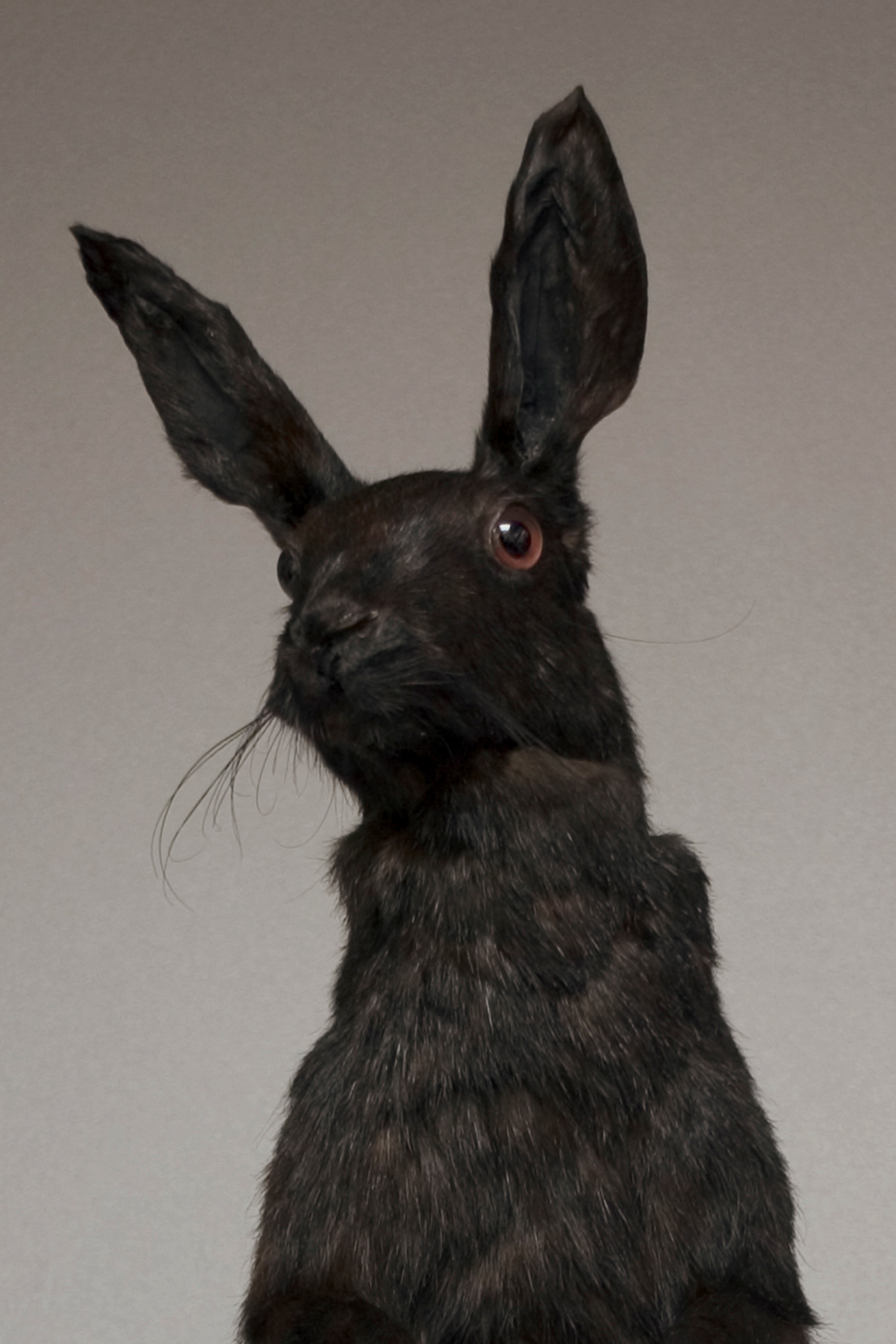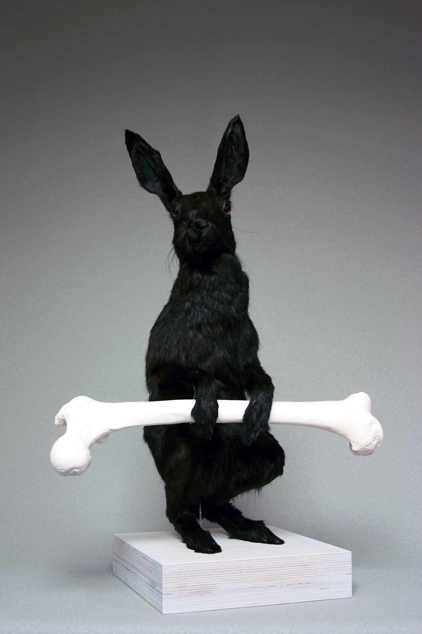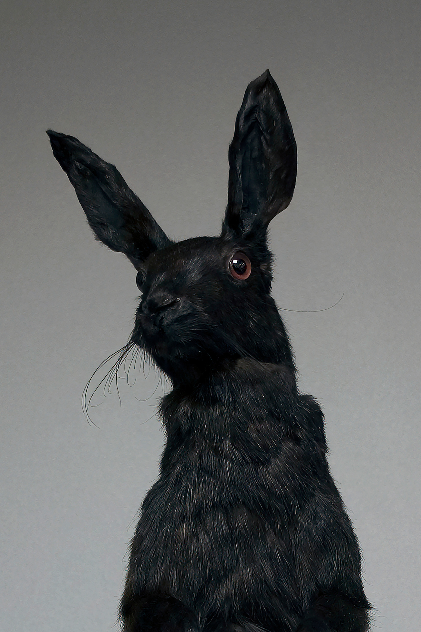 Black Hare. Fur, wood and synthetic resin, 60 x 42 x 28 cm.