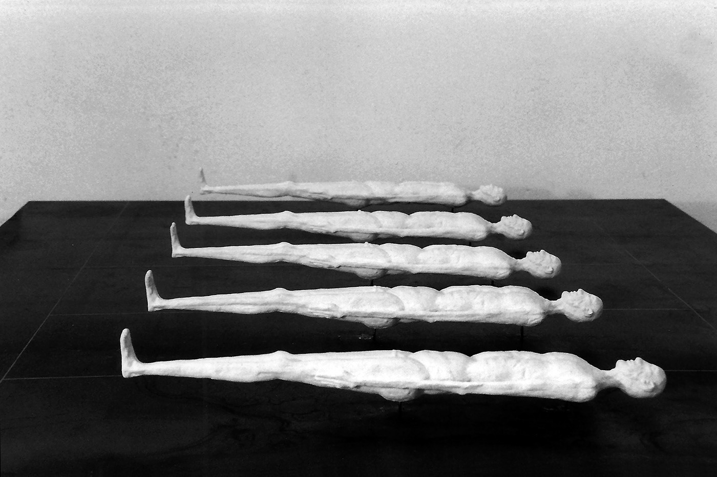 Life size grand pianos filled with oil.